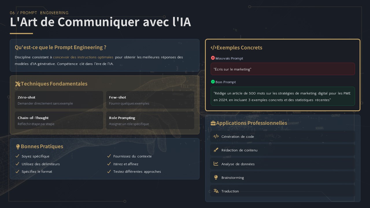 Un bon prompt serait : ‘Tu es un expert en marketing digital avec 10 ans d’expérience en B2B. Rédige un article de blog de 600 mots sur les 3 stratégies de marketing digital les plus efficaces pour les PME françaises en 2024. Utilise un ton professionnel mais accessible, inclus des exemples concrets et termine par un appel à l’action.’ Ce prompt donne un rôle, un format, une longueur, un contexte, un ton et un objectif. Le résultat sera radicalement meilleur.