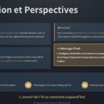 Au terme de ce parcours, vous avez acquis une vision complète et nuancée de l’Intelligence Artificielle. Vous comprenez que l’IA est un domaine de l’informatique visant à simuler certaines formes d’intelligence humaine, avec trois piliers fondamentaux : l’apprentissage automatique, le traitement du langage naturel et la vision par ordinateur.