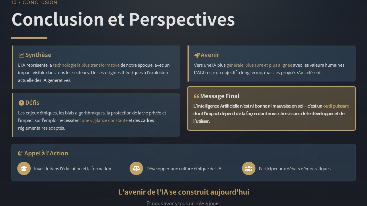 L’Intelligence Artificielle n’est ni bonne ni mauvaise en soi. C’est un outil — le plus puissant que l’humanité ait jamais construit — dont l’impact dépend entièrement de la façon dont nous choisissons de le développer et de l’utiliser.